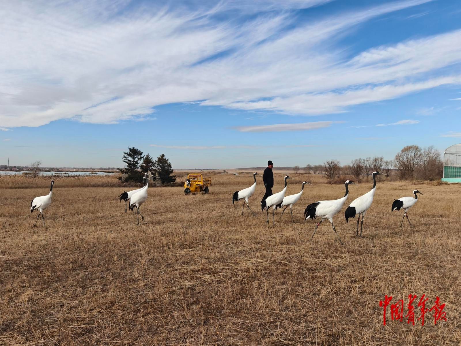 十余只丹顶鹤舒展着黑白分明的羽翼,在保护区上空缓缓盘旋。11月12日,中青报·中青网记者跟随金亮来到图牧吉国家级自然保护区,听他讲“生态警长”如何守护“百鸟天堂”,成为“候鸟亲人”的故事。