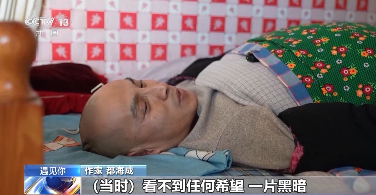 作家 都海成:有一天我姑姑来给我带了一本书,来了之后就跟我说,海成你不能每天这样躺着,你这样躺着毫无意义,浪费时间。她让我看看书,目的就是让我不要胡思乱想。